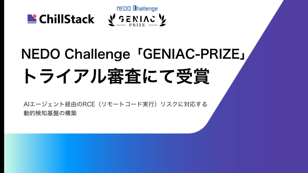 AIを用いた高精度な不正検知サービスやサイバーセキュリティサービスを開発・提供している株式会社ChillStack(本社:東京都渋谷区、代表取締役:伊東 道明、以下「ChillStack」)は、経済産業省と国立研究開発法人新エネルギー・産業技術総合開発機構(NEDO)が実施する懸賞金活用型プログラム「GENIAC-PRIZE」の「生成AIの安全性確保に向けたリスク探索及びリスク低減技術の開発」において、トライアル審査67件の応募の中から8件の受賞プロジェクトの一つに選出されました。